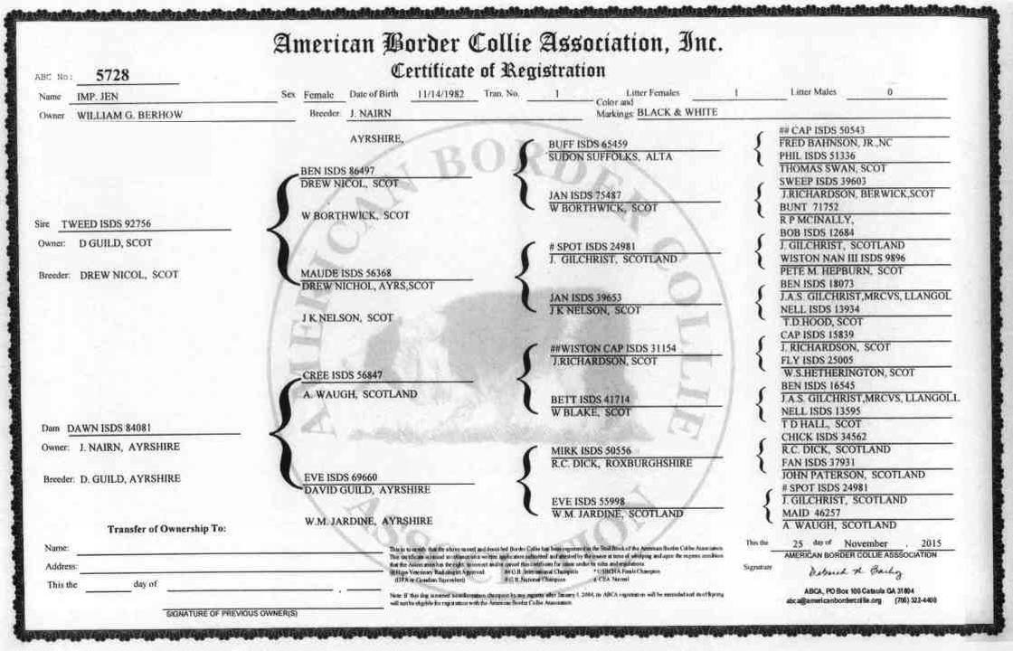 Jen has added a valuable genetic base to the American Border Collie and has contributed greatly to the increased popularity and success of the breed in the United States.